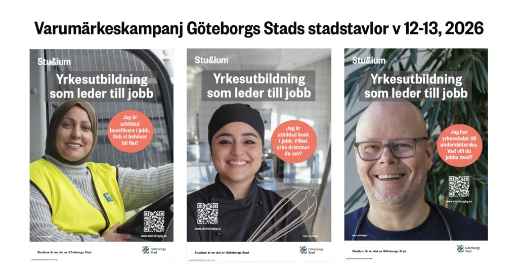 Det är tre av våra fantastiska elever från tre av våra yrkesutbildningar till kock, undersköterska och yrkesförare buss som kommer att synas över hela Göteborg under veckorna 12-13, 2026.